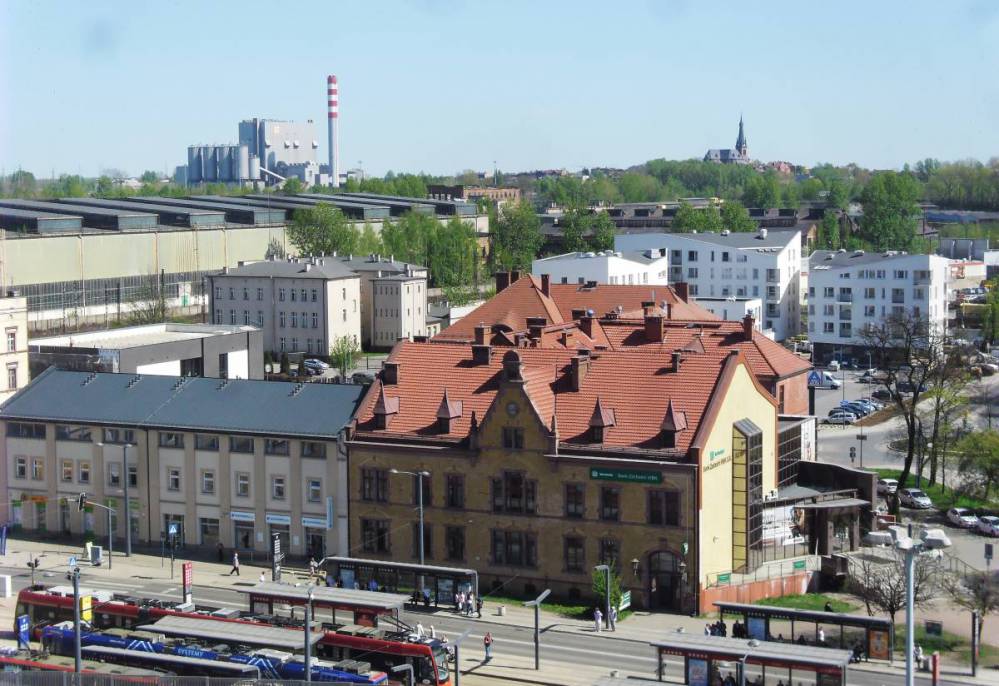 Chorzów, widok z wieży ratusza na Królewską Inspekcję Górniczą, kościół św. Marii Magdaleny, Elektrociepłownię Chorzów (ELCHO) i hale dawnej Huty "Kosciuszko"
