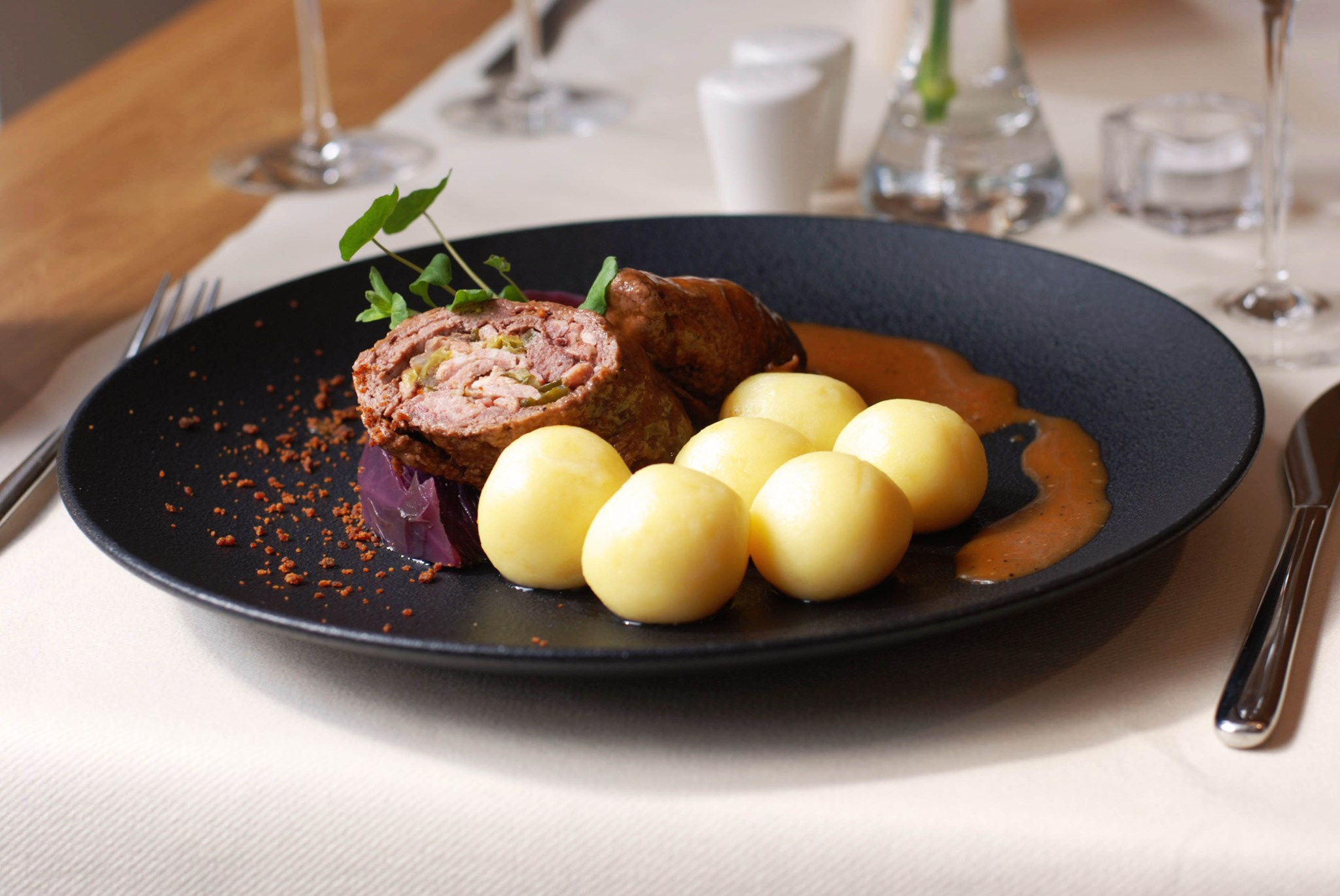 Rolada śląska z białymi kluskami i czerwoną kapustą