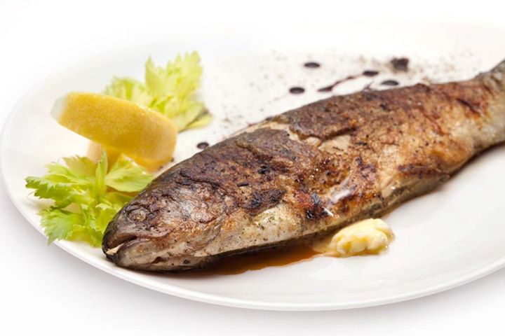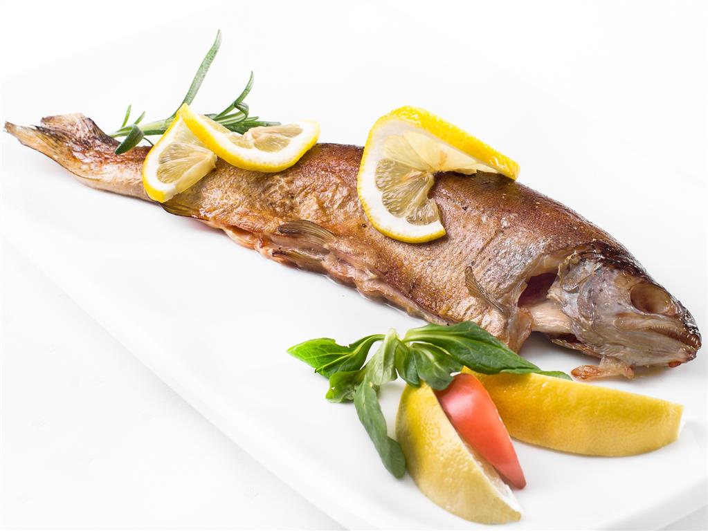 Pstrągi sprawić, nie odcinać głów, usunąć wnętrzności i skrzela. Rybę opłukać, osuszyć. Zrobić kilka nacięć z obu stron i włożyć cienkie plastry czosnku. Resztę czosnku drobno pokroić, wymieszać z posiekaną natką pietruszki i masłem, a następnie nafaszerować tym ryby. Lekko natrzeć solą i pieprzem. Skropić sokiem z cytryny i odstawić na godzinę. Na patelni rozgrzać tłuszcz, ryby obtoczyć w mące i smażyć 6–7 minut na każdej ze stron, delikatnie obracając, aby nadzienie nie wypłynęło. Podawać z cytryną.