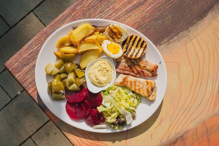 Sałatka Rogata: filet z kurczaka, boczek, oscypek z grilla, buraczki marynowane, ogórek kiszony, jajko, ziemniaki, mix sałat
