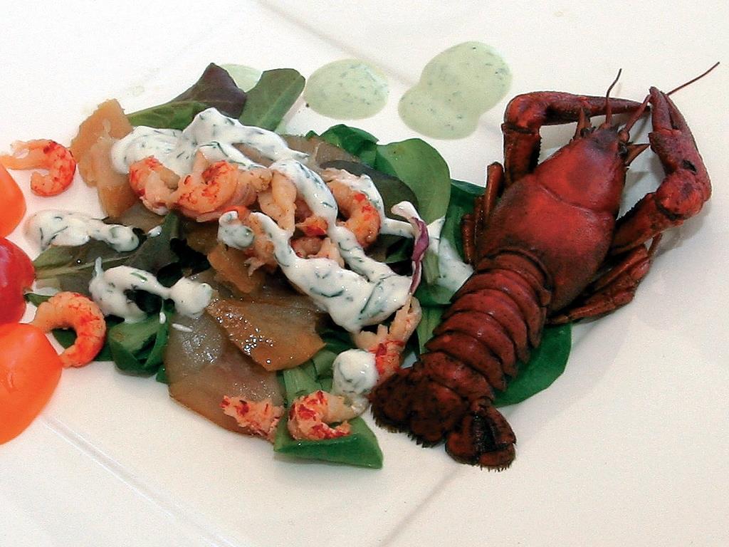 Raki gotujemy we wrzątku z włoszczyzną do czerwoności. Filety rybne kroimy w spore kawałki. Obieramy mięso z raków i przekładamy rozdrobnioną sałatą.