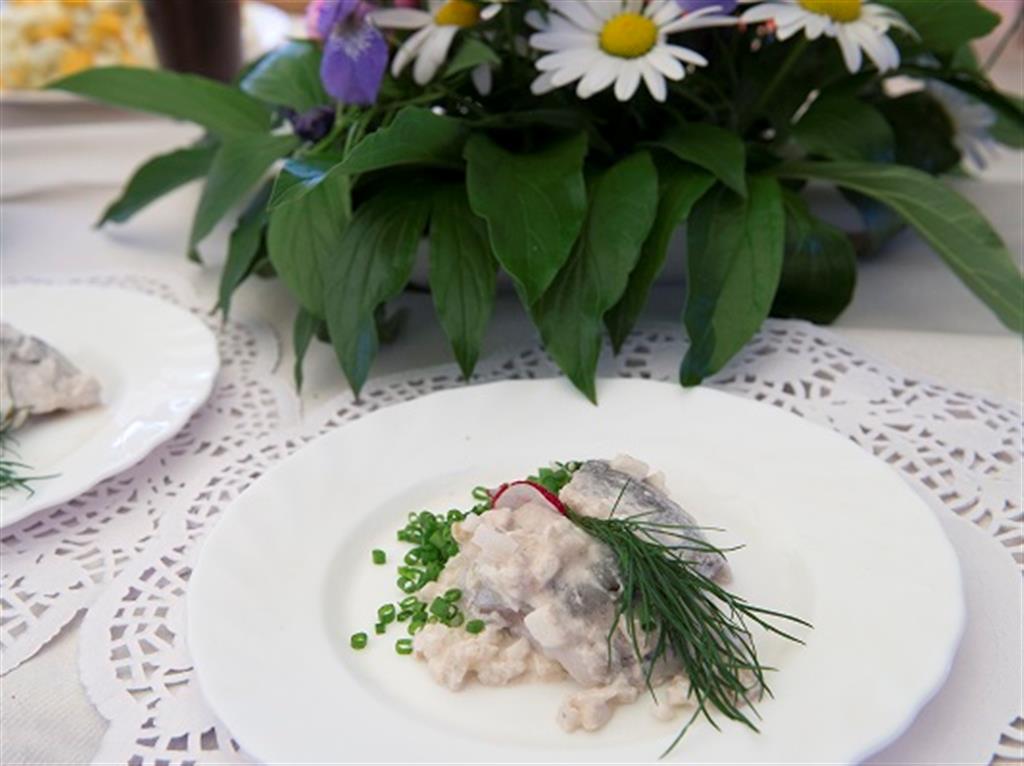 Śledzie moczymy i dzielimy na 3 porcje: 1 - marynujemy z pieczarkami, cebulą, ogórkiem konserwowym, podajemy na pieczonym z miodem i anyżem buraku, dekorujemy pianą smakową,