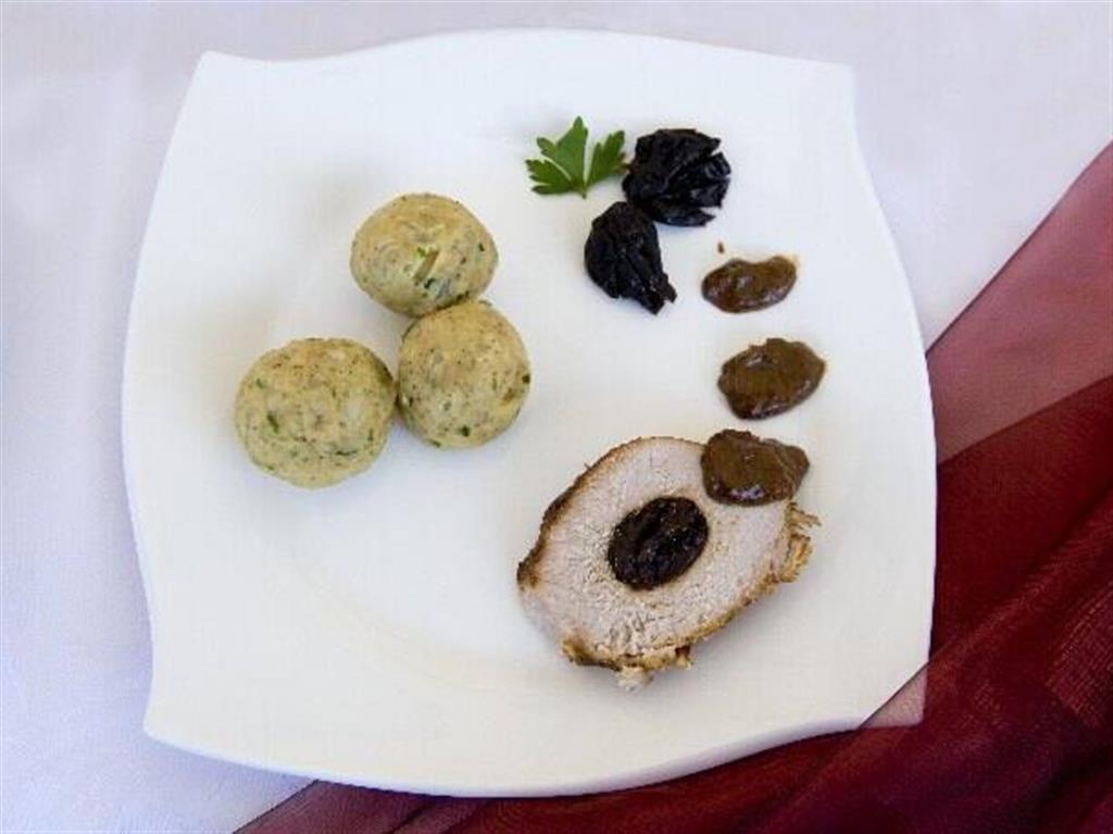 W środku schabu bez kości nacinamy otwór, w który wsadzamy sparzone śliwki, nacieramy solą, przekładamy do brytfanny i obkładamy pozostałymi śliwkami. Całość oblewamy smalcem. Pieczemy, polewając sosem pozostałym z pieczenia i skrapiając wodą z parzenia śliwek. Po upieczeniu schabu sos i śliwki przecieramy przez sito. Następnie schab oprószamy mąką, zalewamy sosem, dodajemy miód, doprawiamy do smaku i chwilę dusimy.
