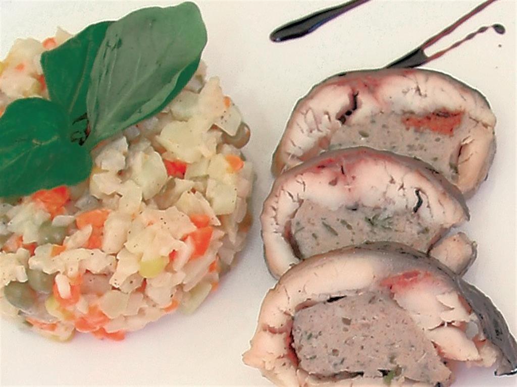 Dwa filety z ryby przepuszczamy przez maszynkę, dodajemy jedno jajko, sól, pieprz, dwa ugotowane jajka pokrojone w kosteczkę i posiekaną pietruszkę. Wszystko dokładnie mieszamy. Resztę filetu rozbijamy, nakładamy na nią farsz i zawijamy w folię. Pieczemy w piekarniku ok. 1 godzinę w temp 160°C.