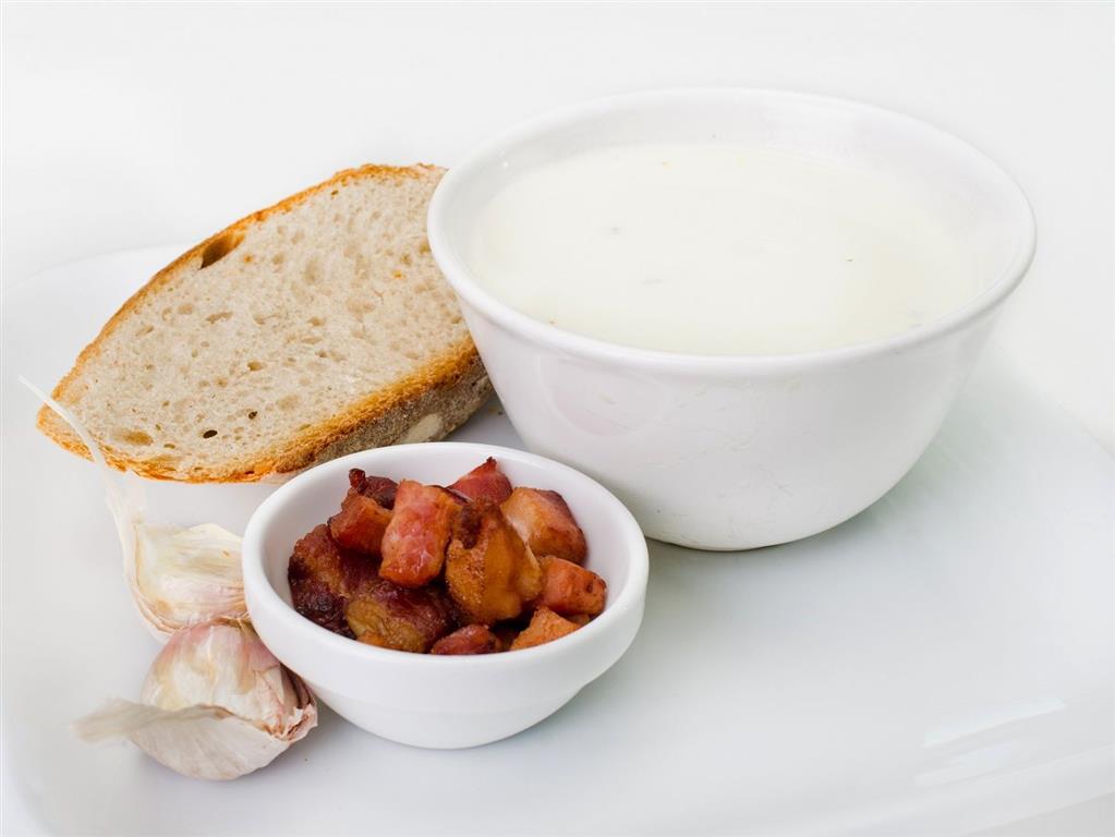 Zagotować wodę, dodać roztarty czosnek, pokrojoną w kostkę cebulę. Maślankę połączyć ze śmietaną, bryndzą i mąką. Wszystko zlać do wody z czosnkiem i zagotować. Boczek drobno pokroić, usmażyć szpyrki i dodać do zupy. Podawać z chlebem.