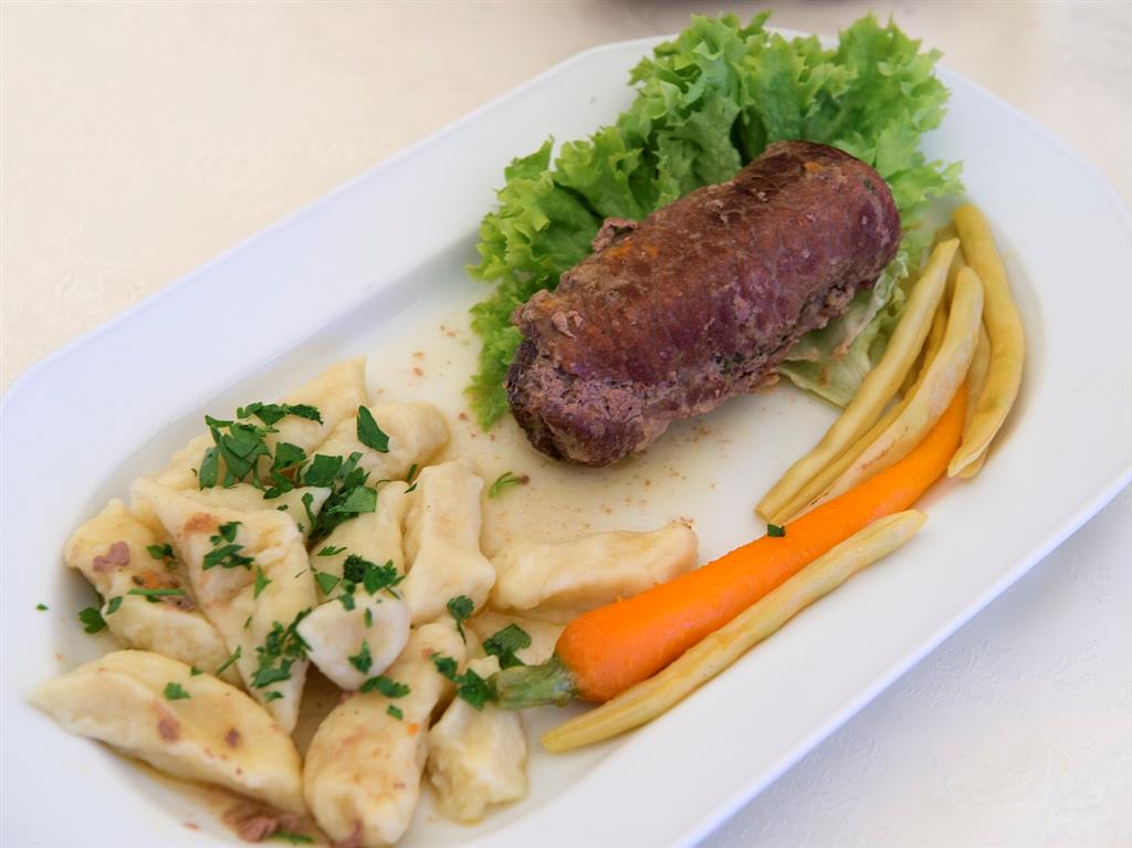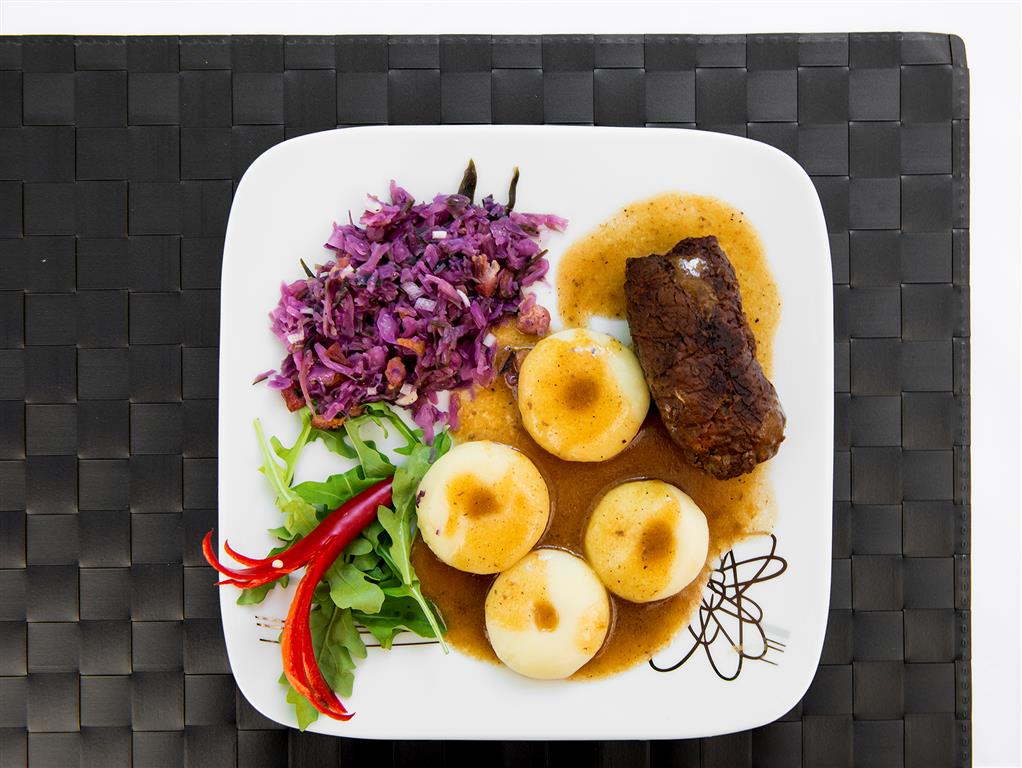 Rolada wołowa z domowymi kluskami i czerwoną kapustą