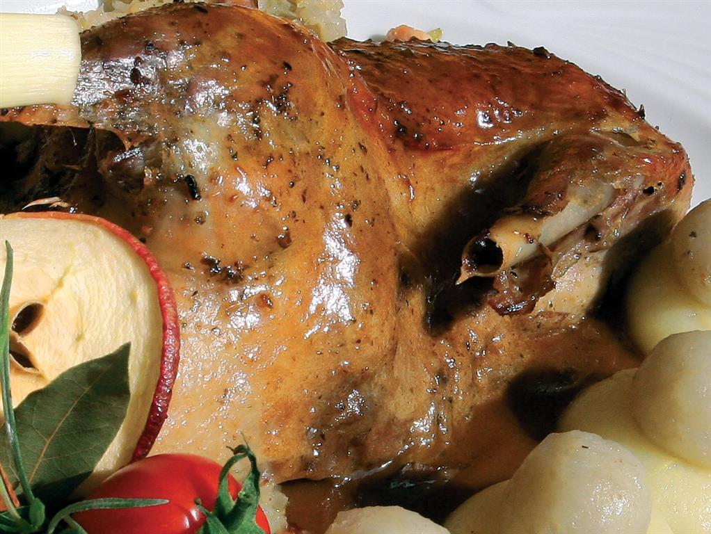 Kaczkę przyprawiamy solą, pieprzem i papryką podpieczoną z margaryną i masłem. Pod koniec pieczenia dodajemy pokrojone jabłka i dusimy jeszcze ok. 15 minut.