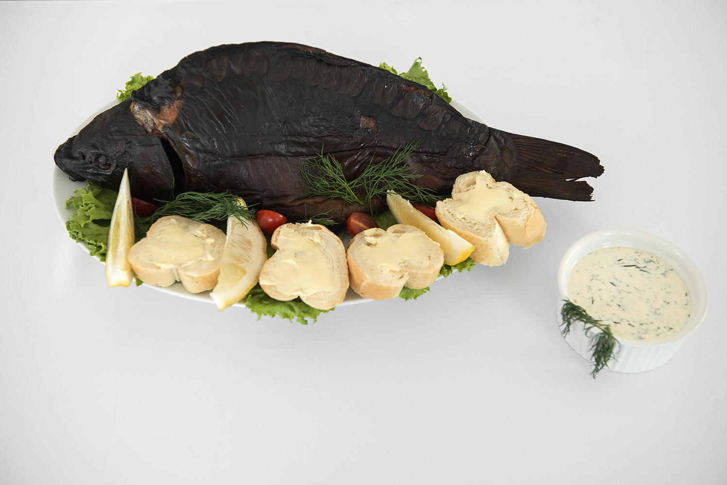 Oprawionego karpia natrzeć (według smaku) solą, pieprzem i czosnkiem, odstawić na ok. 1 godzinę. Następnie uwędzić powoli przez 1-2 godzin w zależności od masy ryby. Podawać ze świeżym pieczywem posmarowanym masłem. Udekorować świeżą gałązką rozmarynu.