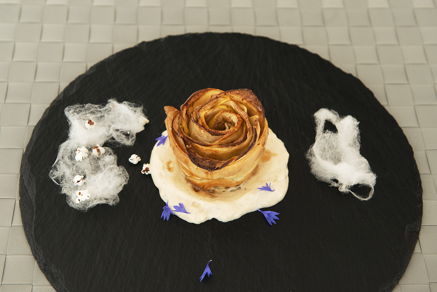 Różyczkę sztrudla jabłkowego podajemy na głębokim talerzu w pianie z rodzynkami oraz pokruszoną czarną bezą.
