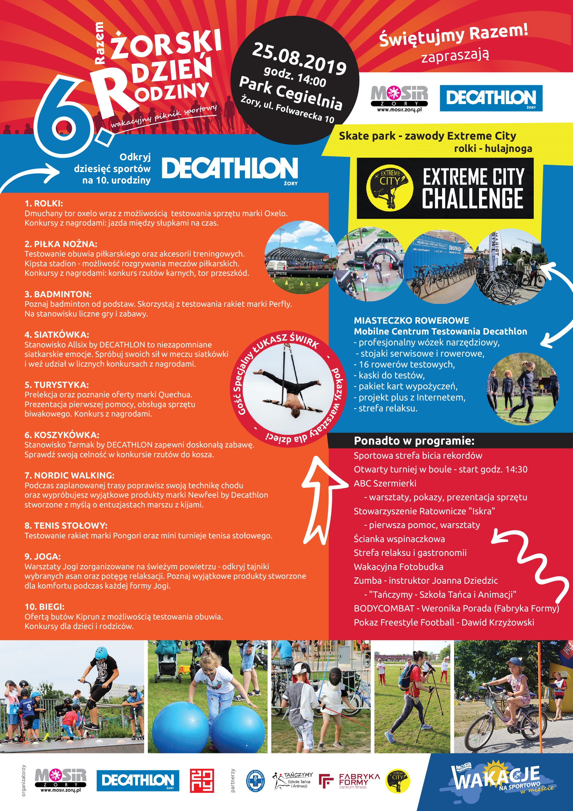 Końcówka sierpnia wyzwoli moc sportowych wrażeń i pozytywnych emocji! Miejski Ośrodek Sportu i Rekreacji w Żorach oraz Decathlon Żory, organizują wielkie sportowe święto z licznymi atrakcjami. Już w niedzielę, 25 sierpnia od godziny 14:00 na terenie całego Parku Cegielnia, startuje największa, wakacyjna impreza sportowa z mnóstwem niespodzianek dla każdego. Czeka nas bardzo bogaty program, podczas którego z pewnością każdy znajdzie coś dla siebie.