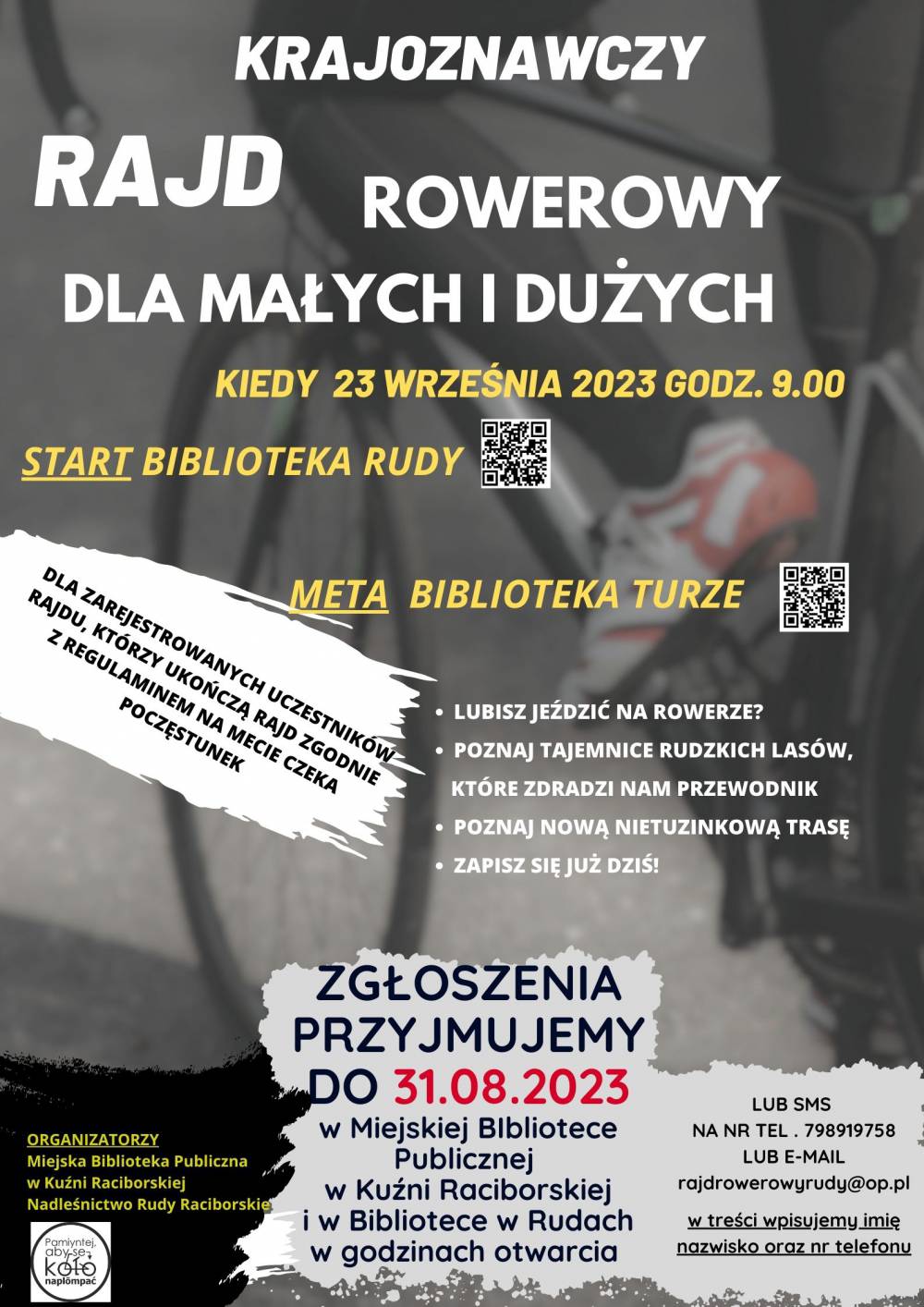 Chcesz pojeździć na rowerze w doborowym towarzystwie, a przy okazji poznać nieznane tajemnice rudzkich lasów ? Zapisz się już dziś na Krajoznawczy Rajd Rowerowy dla Dużych i Małych organizowany przez Bibliotekę w Rudach. Dla zarejestrowanych uczestników rajdu, którzy przejadą trasę zgodnie z regulaminem na mecie czeka poczęstunek oraz losowanie atrakcyjnych nagród ufundowanych przez sponsorów Start rajdu 23 września 2023 r., godz. 9.00, miejsce- Biblioteka Rudy. Zgłoszenia przyjmujemy do 31 sierpnia w Miejskiej Bibliotece Publicznej w Kuźni Raciborskiej, Bibliotece w Turzu oraz Bibliotece w Rudach w godzinach ich otwarcia. Zapraszamy!