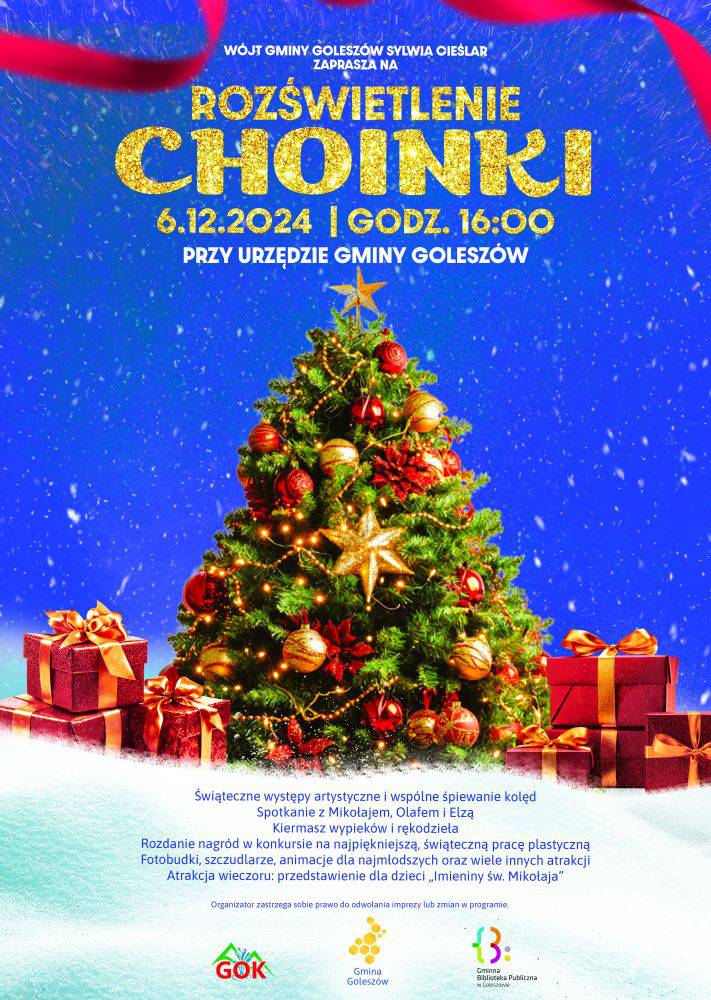 Wójt Gminy Goleszów Sylwia Cieślar, Gmina Goleszów, Gminny Ośrodek Kultury w Goleszowie oraz Gminna Biblioteka Publiczna w Goleszowie zapraszają na tradycyjne rozświetlenie choinki oraz wspólne obchody imienin św. Mikołaja!