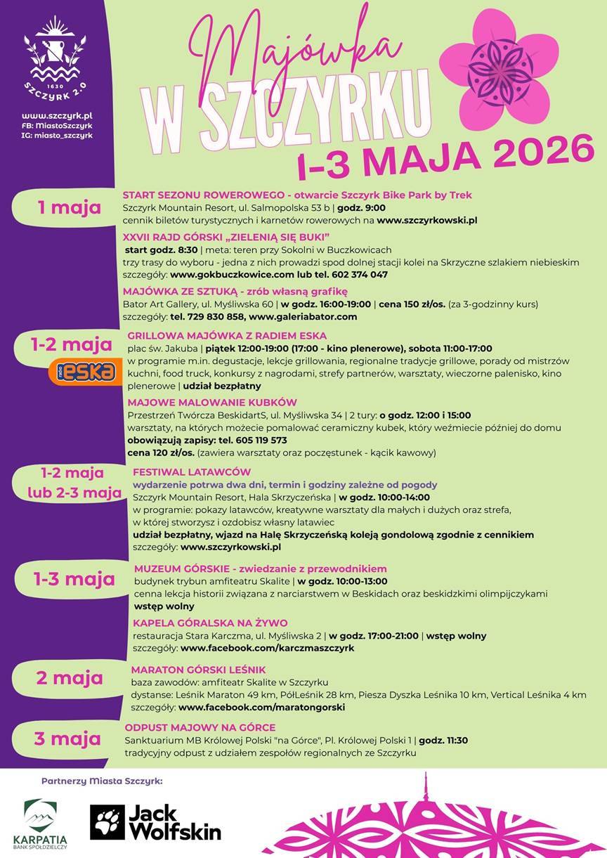 W planach m.in. inauguracja sezonu rowerowego oraz Festiwal Latawców w Szczyrk Mountain Resort, Grillowa Majówka z Radiem ESKA na placu św. Jakuba, warsztaty w Przestrzeni Twórczej BeskidartS z Kamelo Ceramika i w Bator Art Gallery, Maraton Górski Leśnik z bazą przy amfiteatrze Skalite, a także koncerty muzyki góralskiej na żywo w Starej Karczmie.