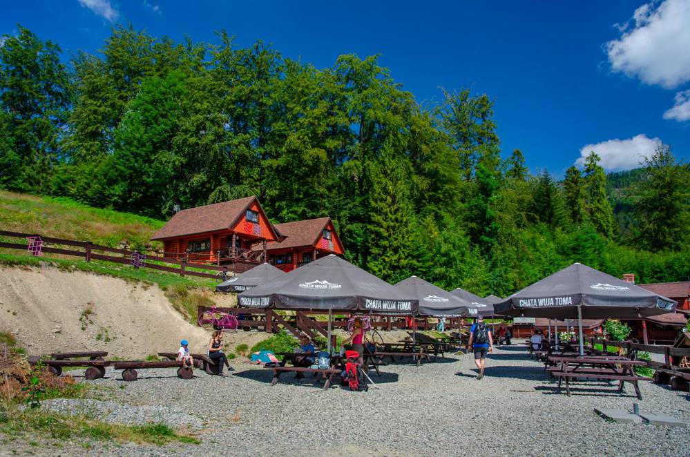 Do początku szlaku w Brennej Bukowej można dojechać autem (kilka darmowych parkingów) bądź autobusem z centrum miejscowości. Szeroka, leśna droga wspina się ku Przełęczy Karkoszczonka (729 m n.p.m.), poniżej której znajduje się prywatne schronisko Chata Wuja Toma z pysznym jadłem.
