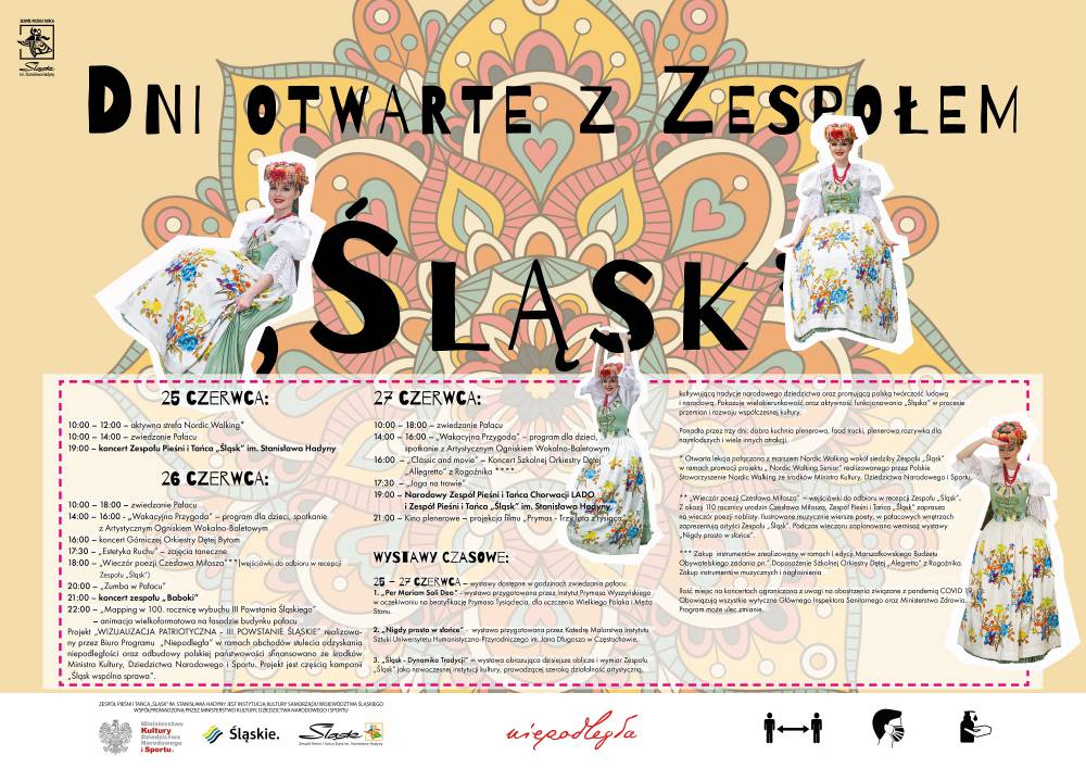 Dni Otwarte z Zespołem Pieśni i Tańca "Śląsk” to impreza trzydniowa, podczas której zaplanowano wiele atrakcji. Większość z nich dostępna w niezwykłej otwartej przestrzeni pałacowo - parkowej w Koszęcinie. Podczas 3 dni imprezy: 25-27 czerwca będzie można wziąć udział między innymi w koncertach, wydarzeniach edukacyjnych, wystawach oraz pokazach multimedialnych.