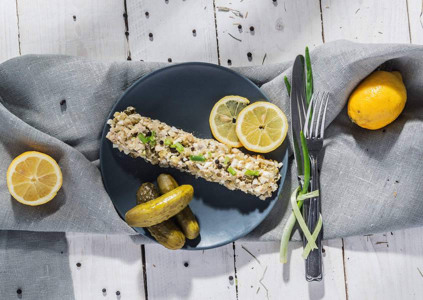 Płaty śledziowe moczymy 2-3 godziny. Wszystkie składniki drobno siekamy, łączymy z majonezem i musztardą, przyprawiamy pieprzem. Odstawiamy na kilka godzin do lodówki, aby smaki się „przegryzły”.