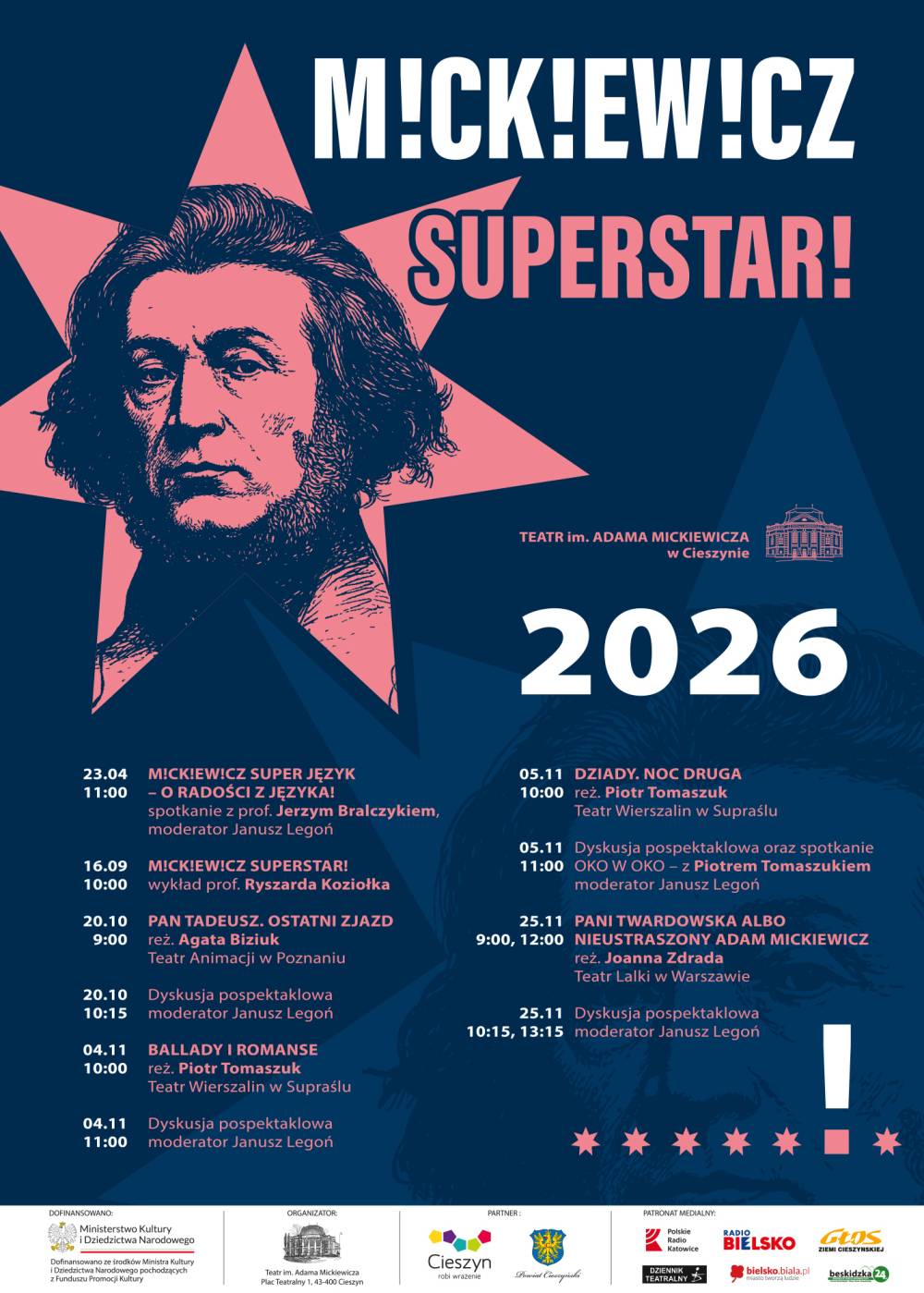 "Dziady Noc Druga", "Ballady i romanse" – w mistrzowskim stylu wyreżyserowane przez Piotra Tomaszuka, dyrektora Teatru Wierszalin oraz "Pan Tadeusz. Ostatni zjazd" w reż. Agaty Biziuk. Dla najmłodszych (od 10 roku życia) widzów "Pani Twardowska albo nieustraszony Mickiewicz" w reż. Joanny Zdrady, które pozwolą młodym widzom spojrzeć na dzieła wieszcza nie tylko jak na obowiązkowe lektury szkolne, ale żywe teksty kultury, pełne emocji i aktualnych treści. Teatr w takim ujęciu stanie się przestrzenią spotkania – miejscem, gdzie młodzi odbiorcy będą mogli doświadczać sztuki w sposób bezpośredni, angażujący i wielowymiarowy.