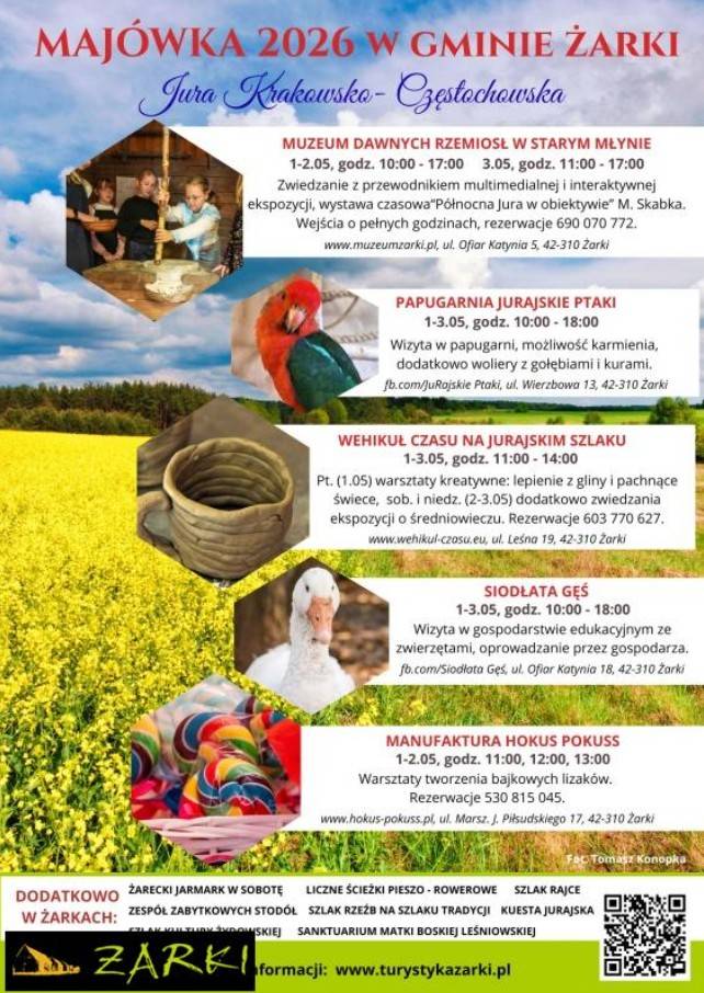 Jeśli szukacie pomysłu na udaną majówkę w sercu Jury, koniecznie zajrzyjcie do Gminy Żarki. W dniach 1–3 maja czeka tam mnóstwo atrakcji dla całej rodziny – od zwiedzania, przez warsztaty, aż po spotkania ze zwierzętami i słodkie przygody.