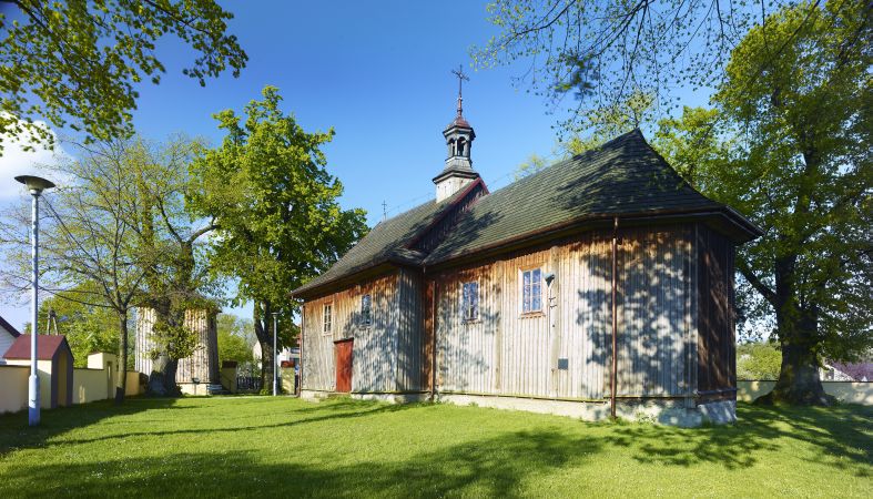 Zrębice Drugie - drewniany kościół św. Idziego z 1789 r. o barokowym wyposażeniu.