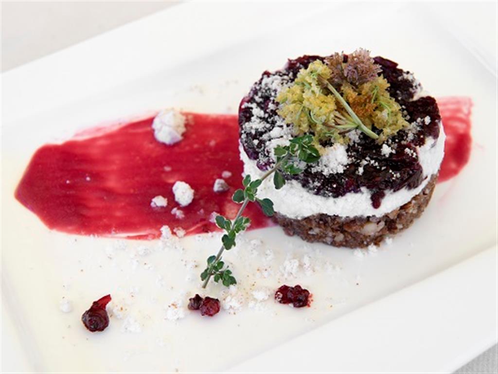 Pokruszyć chleb, orzechy posiekać, wszystko uprażyć na pergaminie. Po ostudzeniu wymieszać z miodem. Serek wymieszać z cukrem pudrem i wanilią. Sporządzić karmel, dodać porzeczki, następnie nalewkę, odparować, zredukować, doprawić. Sporządzić piankę z soku z czarnej porzeczki i buraka. Sporządzić puder orzechowy. Udekorować kwiatami.