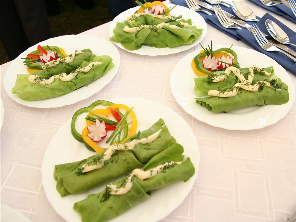 Majonez utrzeć z bryndzą, dodać posiekane orzechy, pokrojoną szynkę i posiekany koperek. Masą smarować liście sałaty i zwinąć, po wierzchu polać majonezem i posypać koperkiem, ułożyć na półmisku i udekorować pomidorem.