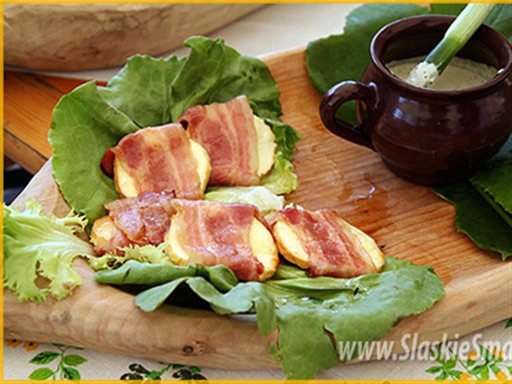 Oscypek zawinąć w cienkie plastry boczku i grillować około 10 minut.