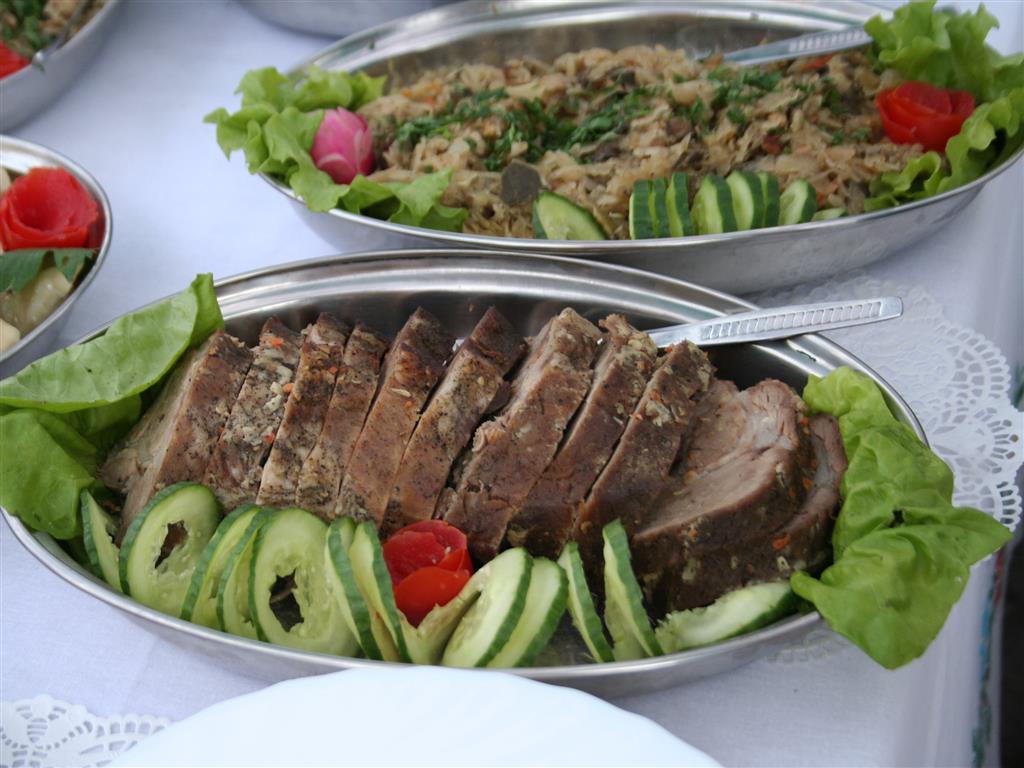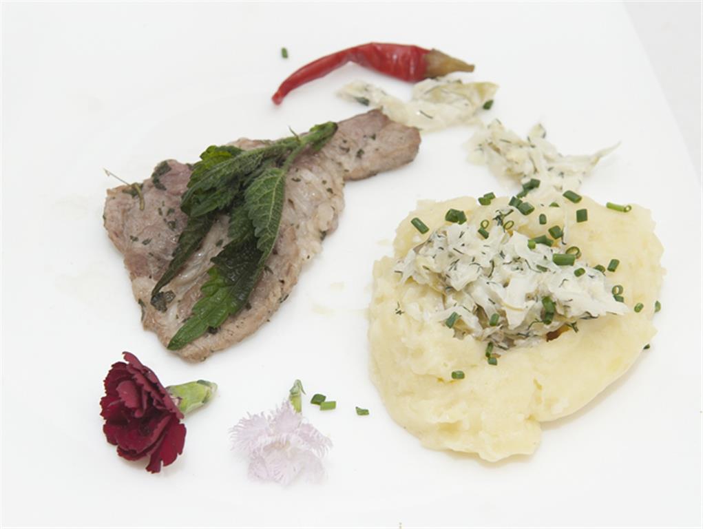 Sporządzamy marynatę z pokrzyw, żubrówki, tymianku. Karczek kroimy w plastry, rozklepujemy, posypujemy solą i pieprzem, pozostawiamy w marynacie co najmniej 1,5 godz., grillujemy. Kapustę szatkujemy, krótko gotujemy w mleku, odcedzamy, dodajemy kremówkę, redukujemy do uzyskania gęstej konsystencji; dodajemy kwaśną śmietanę, koperek i doprawiamy do smaku. Ziemniaki gotujemy, odcedzamy, dodajemy mleko, sporządzamy purée, łączymy ze szczypiorkiem.