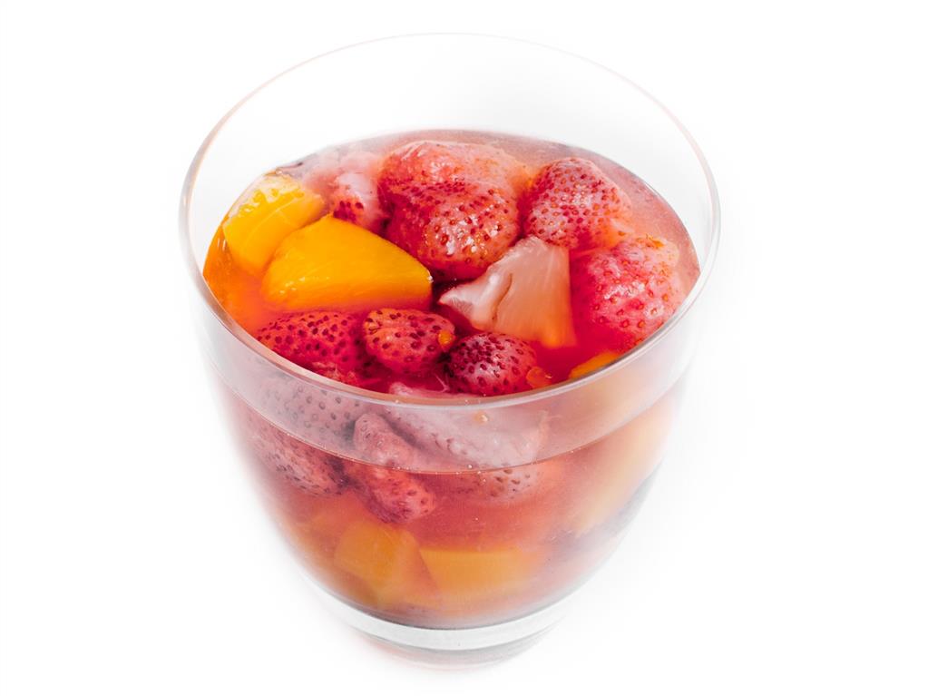 Owoce pokroić w dużą kostkę, przełożyć do szklanej wazy – bołli, dodać wino, wodę mineralną, winiak i część syropu z owoców. Schłodzić, przed podaniem wlać szampana i porcjować szklaną chochelką do szklanych, a najlepiej kryształowych, filiżanek.