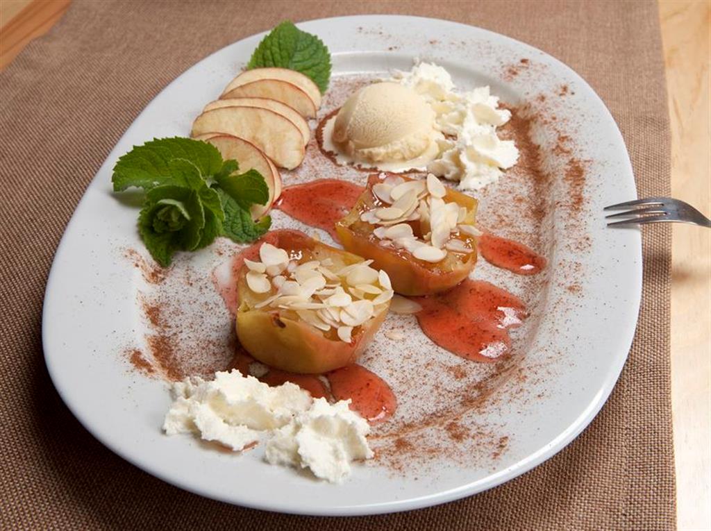 Delikaty i zdrowy deser. Jabłko zapiekane jest z dodatkiem przypraw korzennych i podawane z lodami i bitą śmietaną.