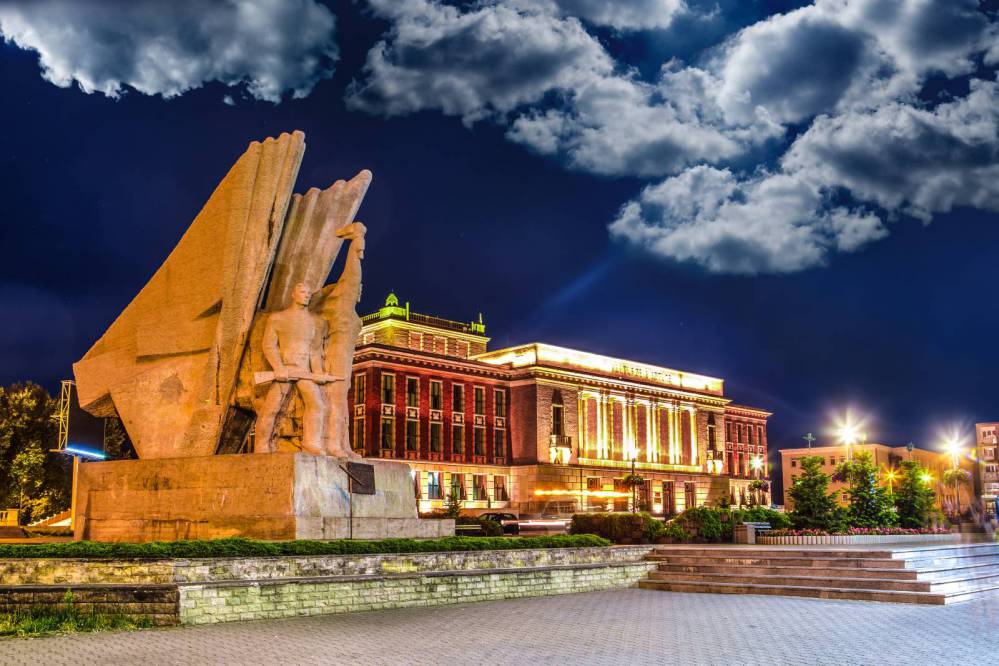 Dąbrowa Górnicza pomnik Bohaterów Czerwonych Sztandarów i Pałac Kultury Zagłębia nocą, fot. Marcin Wróblewski archiwum UM w Dąbrowie Górniczej