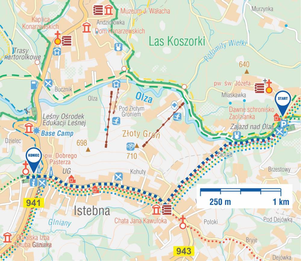 Wędrówkę zaczynamy w Istebnej Zaolziu przy Zajeździe nad Olzą, gdzie znajduje się parking dla samochodów i autokarów. Stąd idziemy SZLAKIEM JANA KAWULOKA do centrum Istebnej. Tu na cmentarzu komunalnym pochowany jest patron szlaku którym idziemy – Jan Kawulok, wybitny folklorysta tej ziemi. Na trasie znajduje się stworzona przez niego Izba Regionalna – zwana Kurną Chatą, lub zwyczajnie: CHATĄ KAWULOKA. Chatę można zwiedzać, ale trzeba swoją wizytę umówić. Utrudnieniem będzie wejście do tego obiektu: do pokonania kilka stopni.