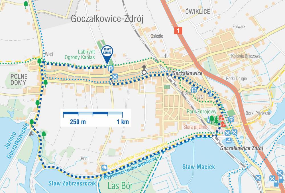 Z Ogrodów Kapias wychodzimy w ul. Św. Anny i po 300 m skręcamy w lewo w ul. Szkolną, którą dochodzimy do Ronda pod Bocianem. Skręcamy w ul. Uzdrowiskową i po 400 m wędrówki, docieramy do PARKU ZDROJOWEGO. Spacerujemy alejkami parkowymi w kierunku ul. Parkowej, przekraczamy ją i kierujemy się w stronę Dworca Kolejowego Goczałkowice-Zdrój. Tuż przed budynkami dworcowymi wchodzimy na asfaltową ścieżkę rekreacyjną i żółty szlak pieszy. Tu skręcamy w prawo, przechodzimy przez tory i żółtym szlakiem wzdłuż zbiorników wodnych Maciek, dochodzimy do terenu leśnego Bór. Idąc dalej żółtym szlakiem po lewej najpierw widzimy STAW ZABRZESZCZAK i zaraz za nim, po lewej, koryto rzeki Wisły wypływające z JEZIORA GOCZAŁKOWICKIEGO. Dochodzimy do ul. Jeziornej. Szlakiem żółtym przeszliśmy 4,3 km. Idąc w lewo wejdziemy na ZAPORĘ JEZIORA GOCZAŁKOWICKIEGO. Spacer po zaporze to punkt obowiązkowy tej wycieczki. Nasza trasa jednak skręca w prawo i ul. Jeziorną wędrujemy jeszcze 1,1 km do skrzyżowania z ul. Zimową. Tu skręcamy w prawo w ul. Zimową i po przejściu 1,2 km jesteśmy na miejscu startu, przy wejściu do Ogrodów Kapias.