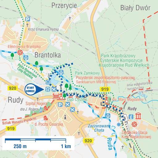Parkujemy SAM/BUS przy ul. Cysterskiej, naprzeciw budynków Pocysterskiego Zespołu Klasztorno-Pałacowego. Zwiedzamy Bazylikę – Sanktuarium Matki Bożej Pokornej. Na budynki opactwa składa się BAZYLIKA MNIEJSZA WNIEBOWZIĘCIA NMP Z XIV WIEKU oraz POCYSTERSKI ZESPÓŁ KLASZTORNO-PAŁACOWY, położony w pięknym PARKU W STYLU ANGIELSKIM, przez który przepływa rzeka Ruda, bardzo popularna wśród kajakarzy. Na wejściu do bazyliki od strony południowej do pokonania dwa stopnie. Po wyjściu z bazyliki, wchodzimy na ul. Cysterską, kierujemy się w stronę stawu i zaraz za nim skręcamy w prawo i wchodzimy w wyraźną ścieżkę, którą dochodzimy do drewnianego mostku. Płynie tu RZEKA RUDA. Za mostkiem po przejściu 200 m dochodzimy do rozwidlenia dróg, przy którym znajduje się drewniany krzyż z 1939 r. zwany „Szklaną kapliczką”. Następnie skręcamy w prawo, aby po około 100 metrach dotrzeć do miejsca, gdzie kiedyś stał pomnik żołnierzy poległych w czasie wojen napoleońskich. Obecnie zostało po nim niestety tylko kilka większych kamieni i trzeba się dokładniej rozejrzeć, by je zobaczyć. Przy obu tych miejscach ustawione są tablice z opisem. Ścieżki, po których wędrujemy, są w dobrym stanie. Wracamy tą samą drogą, za mostkiem skręcamy w lewo, tym razem staw obchodzimy z drugiej strony. Idąc Al. Klodwiga (tablica z opisem), dochodzimy do budynków opactwa. Wchodzimy na otwarty dziedziniec. Opactwo można zwiedzać z przewodnikiem. Wcześniej należy to uzgodnić, szczegóły na stronie: www.rudy-opactwo.pl