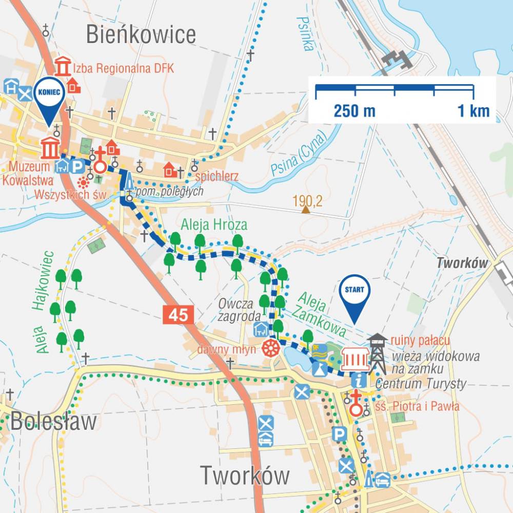 Wracamy do żółtego szlaku, który skręca w ALEJĘ HROZA, położoną na dawnej grobli (z języka morawskiego właśnie na hrozie). Aleja Hroza to unikalny drzewostan. Stare okazy cennych lip drobnolistnych i szerokolistnych, kasztanowców, buków czerwonych i dębów szypułkowych rosną wzdłuż żółtego szlaku na odcinku 1,3 km, prawie aż do ul. Łąkowej w sąsiednich Bieńkowicach. Idziemy dalej żółtym szlakiem, ul. Niwkową i Raciborską. Przekraczamy most na rzece Psina. Ta niewielka rzeka, zwana też Cyną, przez wieki stanowiła granicę etniczno-językową między Morawami a Śląskiem. Mieszkańcy pobliskich Krzanowic nazywają swoją gwarę potocznie „mową morawską”. Ul. Raciborska skręca po 200 m w lewo. Na zakręcie po prawej stoi pomnik poświęcony mieszkańcom wsi, poległym w I i II wojnie światowej. Od pomnika idziemy dalej żółtym szlakiem i po 100 m, za ceglaną kaplicą, skręcamy w prawo, w wąską ścieżkę rowerowo-pieszą. Po 300 m dochodzimy do ul. Szkolnej, tu skręcamy w lewo i dochodzimy do ścieżki rowerowej i chodnika wzdłuż DK 45. Przechodzimy na drugą stronę i jesteśmy w wyjątkowym miejscu. To ZABYTKOWA KUŹNIA W BIEŃKOWICACH, a w niej MUZEUM KOWALSTWA, prowadzone przez rodzinę Sochów. Aby wysłuchać ciekawych historii i zobaczyć pracę kowala należy wcześniej się umówić. Warto. Powrót tą samą trasą lub komunikacją zbiorową do Tworkowa. BUS może podjechać do parkingu przy Muzeum Kowalstwa.