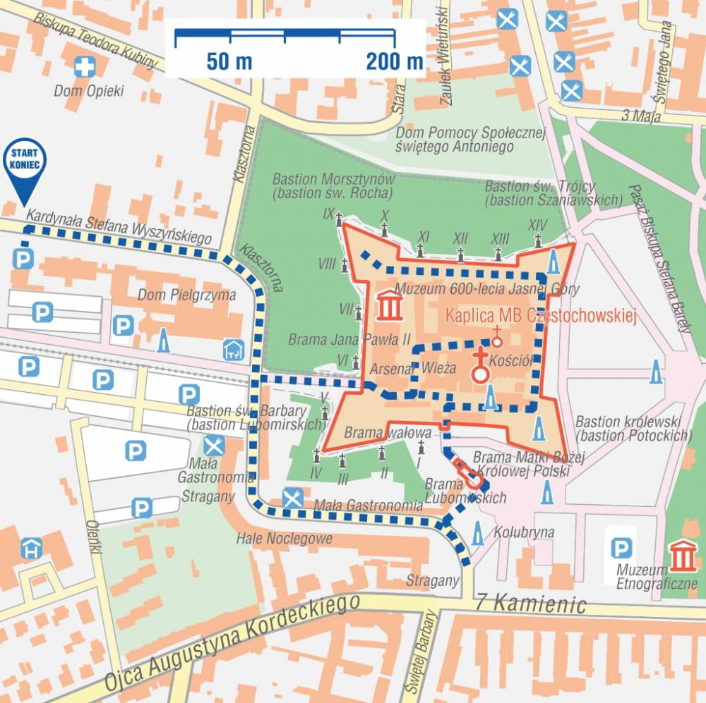 SAM/BUS parkujemy na parkingu przy Jasnej Górze (parkingi od strony Domu Pielgrzyma, wjazd od ul. ks. kard. Stefana Wyszyńskiego). Zwiedzamy Jasną Górę. Wchodzimy na teren klasztorny od strony ul. Klasztornej przez BRAMĘ IM. JANA PAWŁA II. Po przejściu przez bramę wchodzimy na dziedziniec przed Bazyliką, w drugim budynku po lewej Jasnogórskie Centrum Informacji. Tu można dowiedzieć się szczegółów o trasie zwiedzania, można też zamówić przewodnika. Standardowe zwiedzanie z przewodnikiem trwa około 1,5 godz. Wejście do Bazyliki z poziomu dziedzińca – dostępne dla wózkowiczów. Z Bazyliki przechodzimy do KAPLICY CUDOWNEGO OBRAZU CZARNEJ MADONNY. Z udostępnionych do zwiedzania obiektów możliwe jest zwiedzenie MUZEUM JUBILEUSZU 600-LECIA JASNEJ GÓRY (3 stopnie) i ARSENAŁ. Zwiedzanie Sali Rycerskiej dla wózkowiczów jest niedostępne (schody na I piętro). Na poziom WAŁÓW JASNOGÓRSKICH, z których można podziwiać panoramę miasta, wózkowicz z asystentem może się dostać przez schody z podjazdem, przy kaplicy Sakramentu Pokuty. Z tego poziomu wejście do Skarbca jest niedostępne dla osób na wózkach, natomiast dostępny jest BASTION ŚW. ROCHA (ekspozycja militariów i liczne wota). Z poziomu wałów wracamy zejściem przy kaplicy Sakramentu Pokuty. Z dziedzińca przed Bazyliką możemy wyjść również przez Bramę Matki Bożej Zwycięskiej i Bramę Lubomirskich.