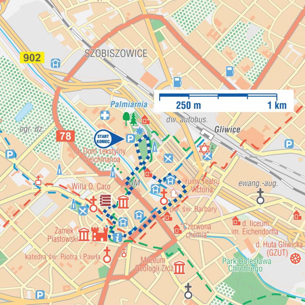 Po wyjściu z Palmiarni skręcamy w alejkę w lewo, wychodzimy po 250 m na ul. Berbeckiego. Wygodną ścieżką pieszo-rowerową dochodzimy do mostku nad Kłodnicą, nazywanego MOSTKIEM ZAKOCHANYCH. Ul. Berbeckiego dochodzimy do Gmachu Sądu Administracyjnego (300 m od wyjścia z Parku Chopina). Skręcamy w prawo w ul. Studzienną, którą idziemy dalej 150 m, do położonej po lewej stronie WILLI CARO. To przykład doskonale zachowanej XIX-wiecznej rezydencji w stylu renesansowej architektury willowej. Obecnie pełni funkcje muzeum, w którym prezentowana jest stała wystawa dziewiętnastowiecznych wnętrz mieszkalnych górnośląskich przemysłowców. Niestety, zarówno wejście, jak i wewnętrzne przejścia nie są dostępne dla osób na wózkach. Spod bramy Willi Caro idziemy prosto do ul. Średniej, którą dochodzimy do ul. Plebańskiej (180 m od Willi Caro).