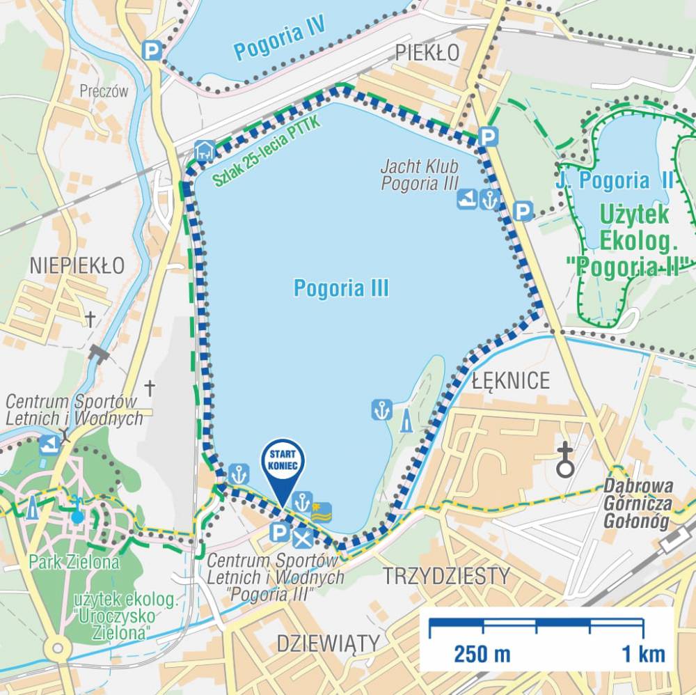 SAM/BUS parkujemy na parkingu przy ul. Malinowe Górki. Przy parkingu biegnie ścieżka rekreacyjna pieszo-rowerowa. Dochodzimy nią do widocznego Jeziora Pogoria III, jest tu plaża i molo. Skręcamy w lewo i ścieżką rekreacyjną wzdłuż której poprowadzony jest czerwony Szlak Rowerowy Wokół Pogorii III wędrujemy przez 6,4 km mając ciągle Jezioro Pogoria po prawej stronie. Na trasie liczne ławeczki, altana odpoczynkowa, plaże.