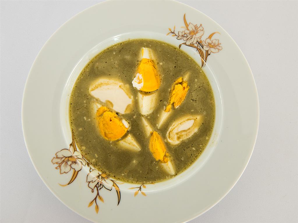 Ugotować około 2 litry wywaru z dowolnego mięsa i warzyw (marchew, seler, por, pietruszka). 2-3 garście świeżo zerwanego i wypłukanego szczawiu drobno pokroić. Na patelni rozpuścić 2 łyżki masła, dodać szczaw i smażyć na jednolitą masę. Wysmażony szczaw przetrzeć przez gęste sito, wymieszać z wywarem mięsno-warzywnym, zabielić szklanką słodkiej śmietany. Doprawić do smaku solą. Ugotowane na twardo jajka pokroić na ćwiartki, ułożyć na talerzach i zalać zupą.