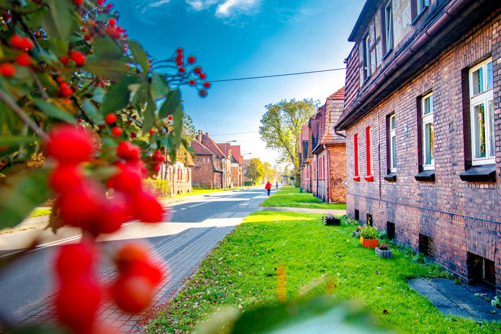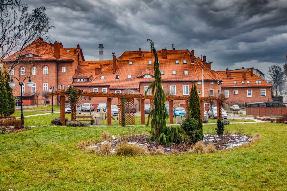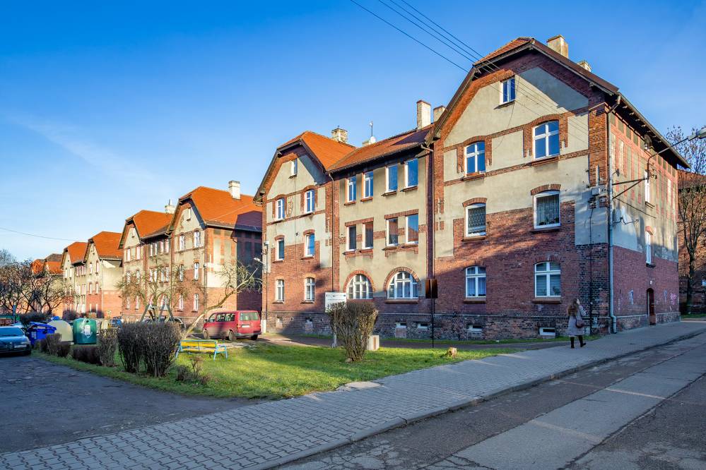Na początku XX wieku właściciele huty i kopalni postanowili zbudować nowoczesne osiedle mieszkaniowe. Tak powstał piękny zespół ceglanej zabudowy o przemyślanym układzie urbanistycznym, zaprojektowany z myślą o wygodzie i codziennych potrzebach rodzin robotniczych. Pierwsze budynki zaczęto wznosić w 1907 roku, a później dzielnica rozwijała się w dwóch znaczących etapach. Do dziś zachowało się mnóstwo obiektów, które są ustawione równo wzdłuż gęstej siatki ulic. Domy są duże, wielorodzinne, trzykondygnacyjne i nakryte dachami naczółkowymi.