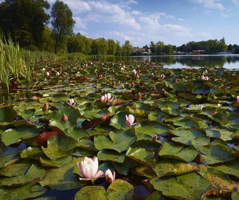 Oczka wodne z nenufarani dodają Rosarium uroku, podobnie jak rzeźby parkowe – w tym ławeczka Karolinki i Karlika – bohaterów śląskiej piosenki.