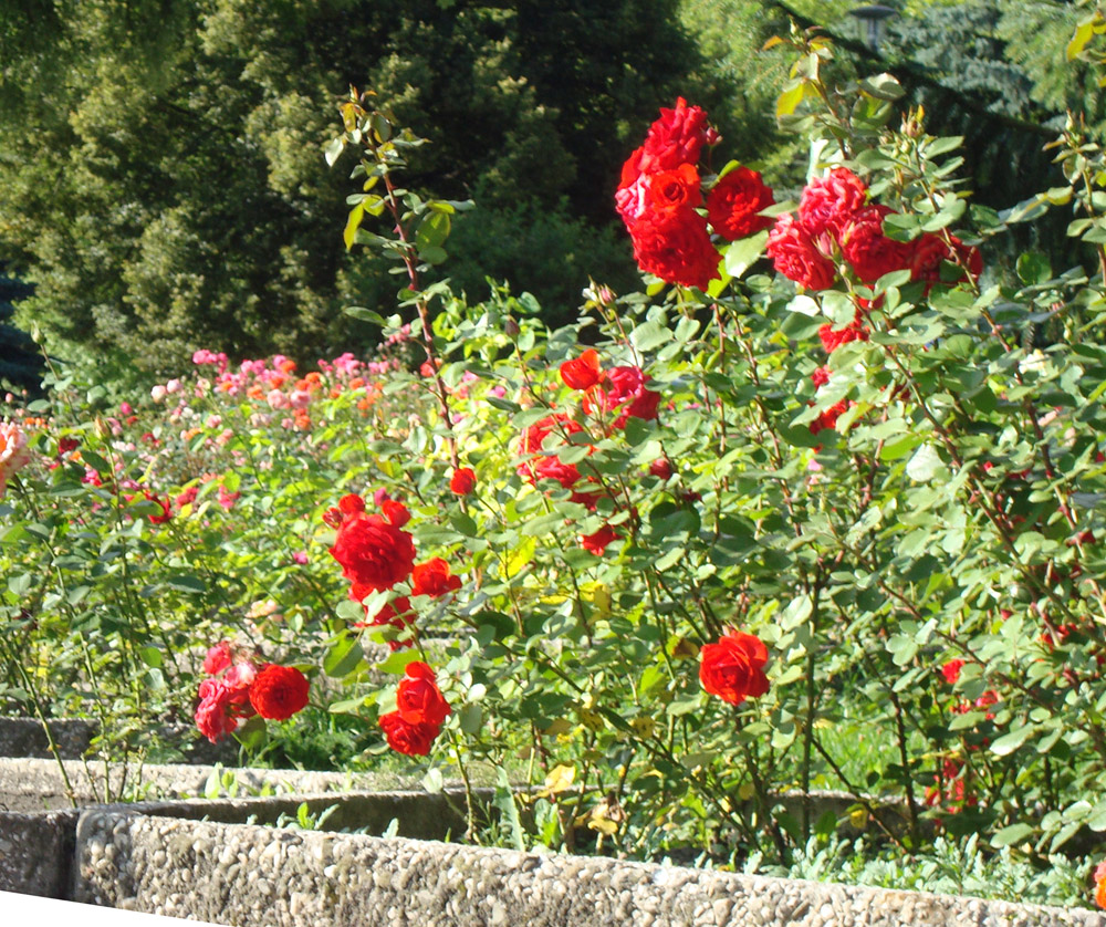 Poza odmianami róż wielokwiatowych (rabatowych), w rosarium trafimy na róże pienne (sztamowe), czepne (pnące) obrastające altany i pergole oraz róże miniaturowe.