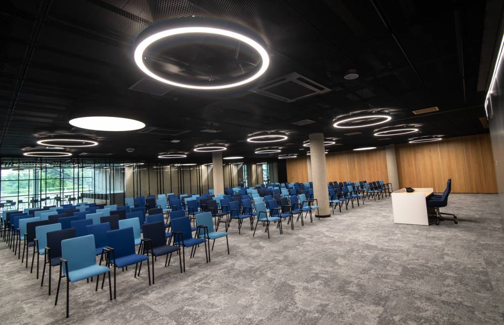 Różnorodne możliwości zaaranżowania sali oraz dwie rozkładane trybuny mieszczące do 360 osób oferują liczne opcje dostosowania przestrzeni do Twoich potrzeb. To miejsce, w którym przeprowadzisz wyjątkową prezentację, seminarium albo zorganizujesz wykład lub szkolenie dla swoich odbiorców.