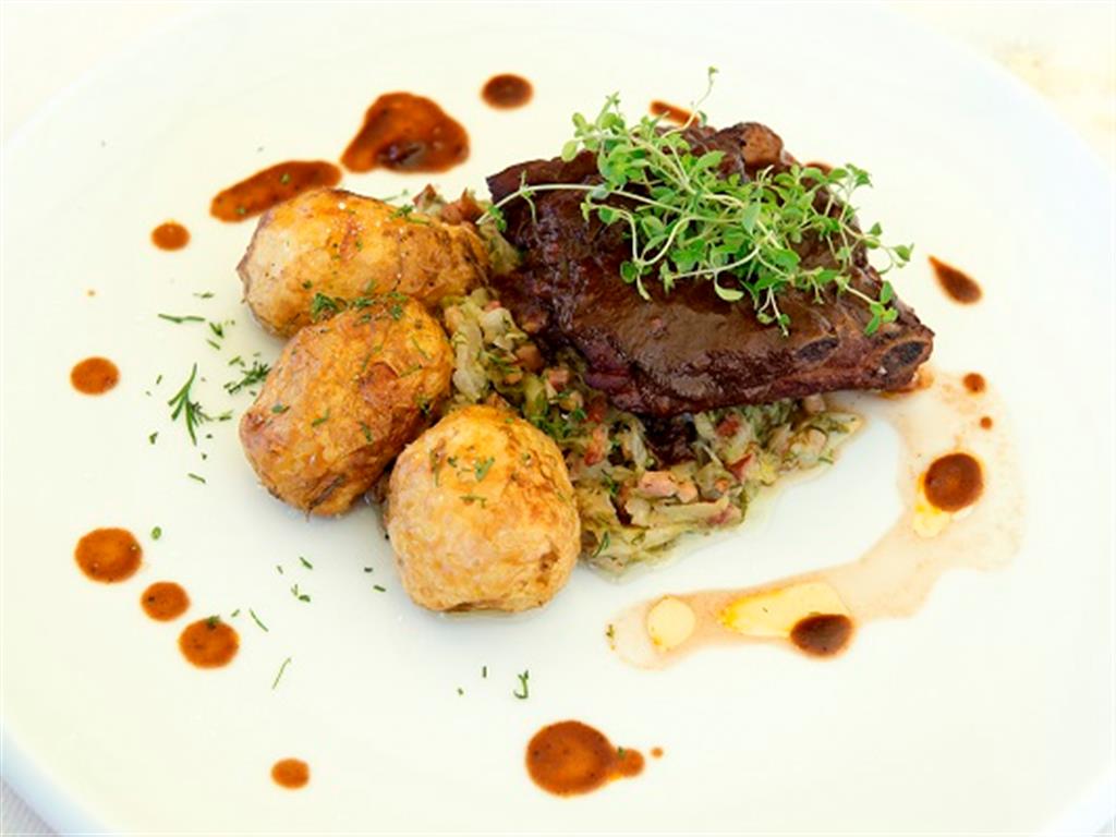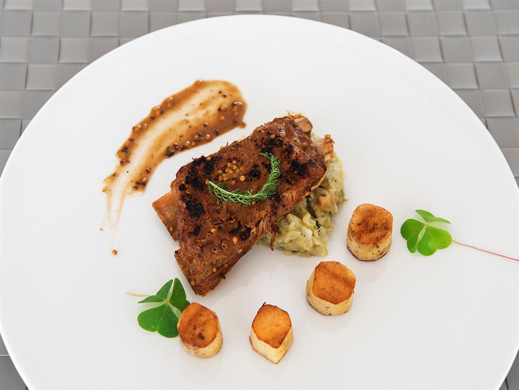 Żeberka zamarynować w koncentracie pomidorowym, winie i czosnku. Doprawić solą i pieprzem. Gotować metodą próżniową. Ziemniaki oczyścić. Gotować confit 3 godziny w 90˚C, wychłodzić. Żeberka wyjąć z worka, zapiec razem z ziemniakami przez 30 minut w temperaturze 180˚C. Zredukować uzyskany sos z gotowania żeberek.