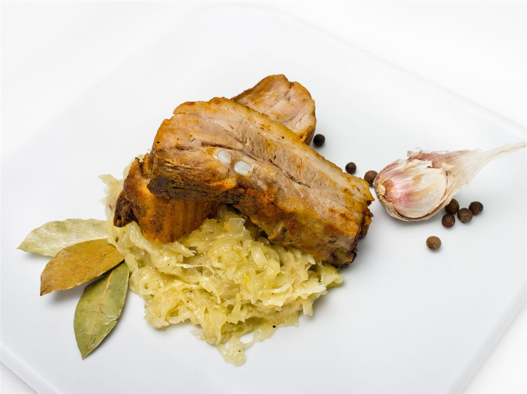 Kapustę ugotować, dodając kilka ząbków drobno pokrojonego lub przeciśniętego przez praskę czosnku, pokrojoną cebulę i przyprawy. Na patelni usmażyć pokrojony w kostkę boczek. Z mąki zrobić zasmażkę. Ugotowaną kapustę zagęścić zasmażką i startym ziemniakiem. Dodać skwarki z boczku i dokładnie wymieszać. Podawać z ugotowanymi żeberkami.