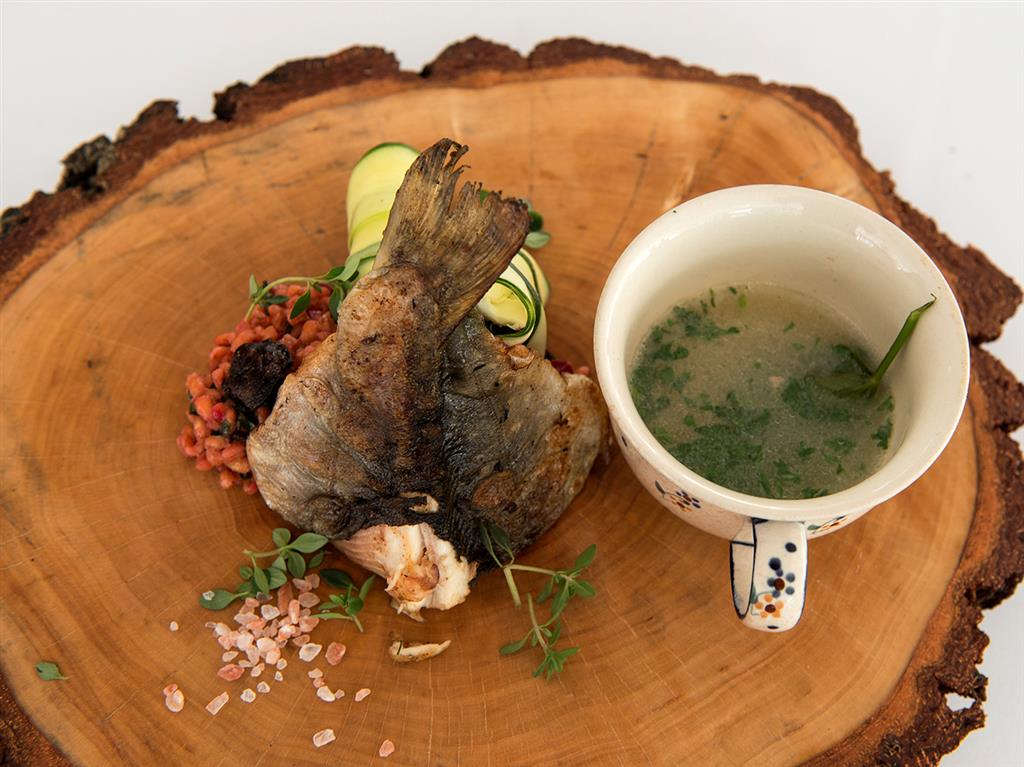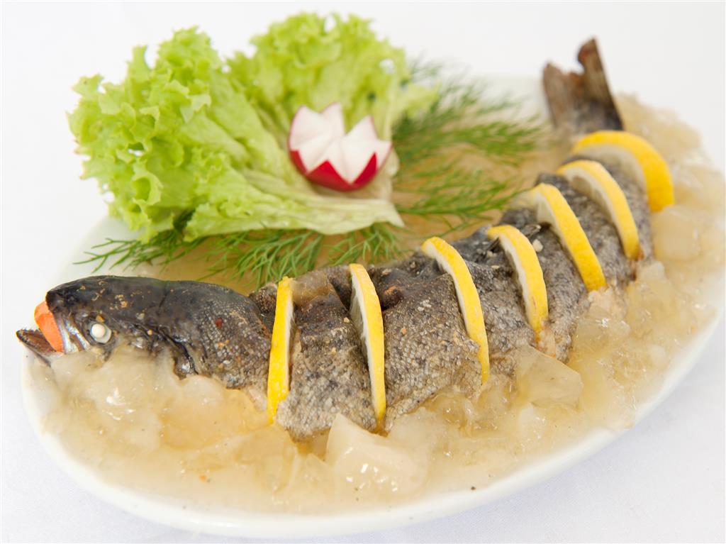 Pstrągi sprawić, nie odcinać głów, usunąć wnętrzności i skrzela. Rybę opłukać, osuszyć. Zrobić kilka nacięć z obu stron i włożyć cienkie plastry czosnku. Resztę czosnku drobno pokroić, wymieszać z posiekaną natką pietruszki i masłem, a następnie nafaszerować tym ryby. Lekko natrzeć solą i pieprzem. Skropić sokiem z cytryny i odstawić na godzinę. Na patelni rozgrzać tłuszcz, ryby obtoczyć w mące i smażyć 6–7 minut na każdej ze stron, delikatnie obracając, aby nadzienie nie wypłynęło. Podawać z cytryną.