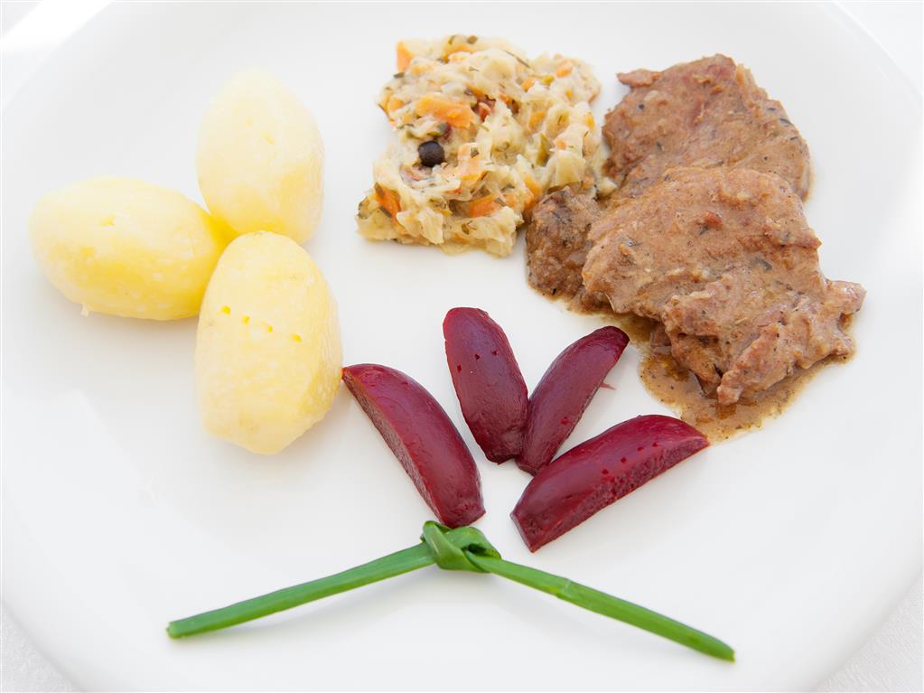 Grzyby usmażyć na niewielkiej ilości oleju z dodatkiem cebuli. Ziemniaki, cebulę obrać, zetrzeć na tarce, przyprawić solą, pieprzem, maggi, dodać jaja, mąkę, śmietanę kremową. Wszystko dobrze wymieszać i porcjować na patelni smażąc na oleju. Steki rozbić młotkiem do mięsa, przyprawić pieprzem, solą, maggi, curry, czosnkiem. Smażyć na oleju do uzyskania odpowiedniej kruchości. Podawać na talerzu placek-stek-placek z dodatkiem smażonych grzybów leśnych.