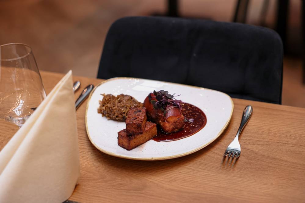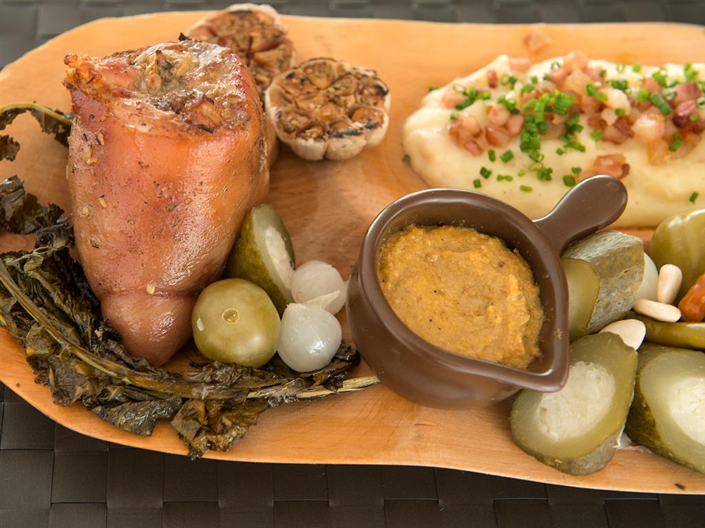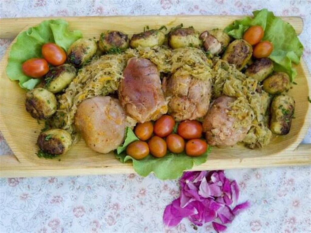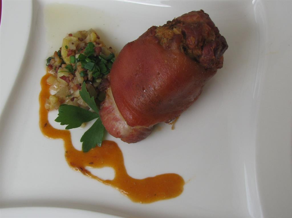 Domowa musztarda – namoczyć gorczycę w occie winnym przez 48 godzin, odcedzić, zmielić gorczycę, dodać oliwę z oliwek, miód, sól, pieprz, połączyć ze sobą. Golonka – umyć mięso, wytrybować kość, natrzeć musztardą, pozostawić na 24 godziny w chłodnym miejscu, warzywa pokroić w paski, podsmażyć na maśle, przyprawić, pozostawić do ostygnięcia. Przygotowaną golonkę nadziać warzywami, zszyć nitką, piec ok. 2 godziny w temperaturze 180oC.