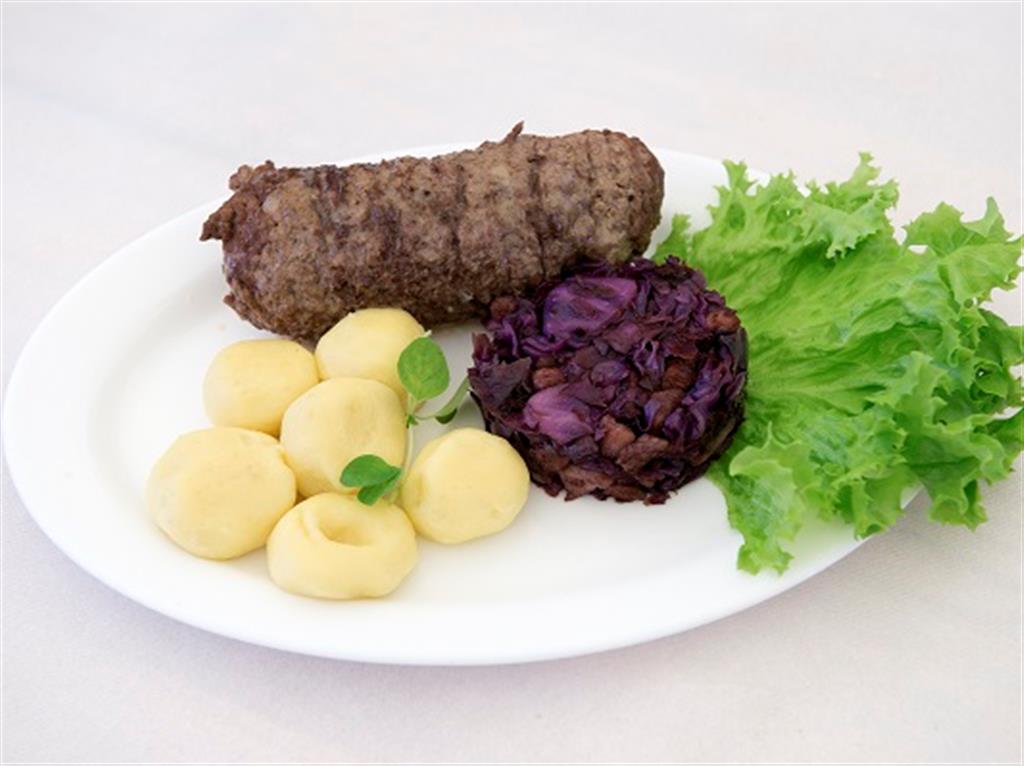 Ziemniaki ugotować w osolonej wodzie, odcedzić i przestudzić. Ciepłe przecisnąć przez praskę na wysypaną mąką stolnicę. Dodać oba rodzaje mąki, jajka i razem szybko wyrobić. Formować wałki i skośne kroić w równe kawałki. Gotować w osolonej wodzie. Szpinak ugotować w osolonej wodzie, dobrze odcisnąć, drobno posiekać i usmażyć na dwóch łyżkach masła. Dodać rozgnieciony czosnek, jajka i namoczoną odciśniętą bułkę, dobrze wymieszać i doprawić do smaku solą i pieprzem. Wołowinę pokroić w plastry, dobrze rozbić, oprószyć przyprawami i mąką. Masę szpinakową rozsmarować na mięsie. Zwinąć rolady, dosmażyć na tłuszczu i dusić w bulionie do miękkości.