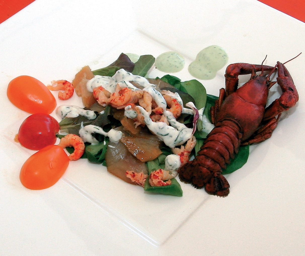 Siekamy drobno koperek i szczypiorek, a następnie miksujemy osobno ze śmietaną i jogurtem. Doprawiamy sosy solą, cukrem i pieprzem, ewentualnie sokiem z cytryny. Mięso raków i ryb podajemy na mieszance sałat, polewamy delikatnie sosem koperkowym i dekorujemy pomidorkami, sosem szczypiorkowym i małymi gotowanymi rakami w całości.
