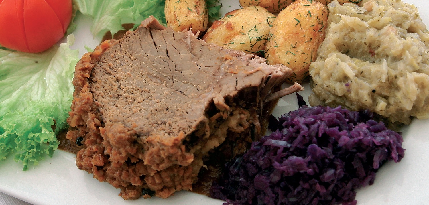 Mięso wkładamy do zaprawy sporządzonej z wody, octu, obranych i startych na tarce warzyw oraz przypraw. Pozostawiamy w chłodnym miejscu na 12 godzin. Po upływie tego czasu w rondlu rozgrzewamy smalec i obrumieniamy na nim wyjęte z zaprawy mięso. Następnie mięso dusimy z dodatkiem warzyw z zaprawy, podlewając co jakiś czas wodą. Gdy będzie już prawie miękkie wyjmujemy je i kroimy w ukośne plastry nie docinając jednak do końca. W nacięcia wkładamy przygotowany ze sparzonej wrzątkiem, przetartej cebuli, bułki tartej, masła i przypraw farsz. Cebulę do farszu można również przesmażyć na tłuszczu. Mięso z nadzieniem delikatnie przekładamy do brytfanny, podlewając przetartym sosem uzyskanym z pieczenia i pieczemy do miękkości, po czym wyjmujemy i pozostawiamy w ciepłym miejscu. Sos zagęszczamy niewielką ilością zawiesiny z mąki i wody. Ciepłe mięso kroimy co drugi plaster, tak aby nadzienie pozostało wewnątrz plastrów. Podajemy na ciepło z ziemniakami bądź kluskami, układając mięso na sos.